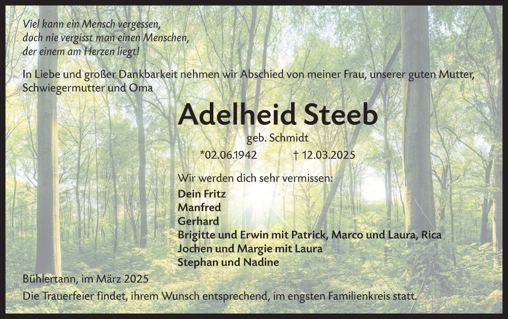 Hier finden Sie alle Traueranzeigen aus der Zeitung, die bisher für Adelheid Steeb erschienen sind. Weitere Traueranzeigen, die in der Zeitung erscheinen, werden hier ebenfalls aufgelistet