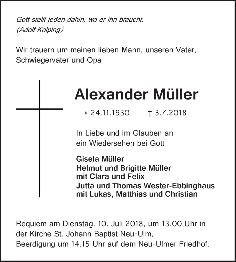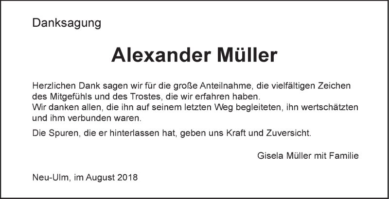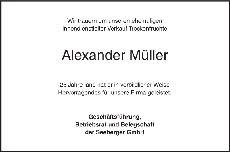 Hier finden Sie alle Traueranzeigen aus der Zeitung, die bisher für Alexander Müller erschienen sind. Weitere Traueranzeigen, die in der Zeitung erscheinen, werden hier ebenfalls aufgelistet
