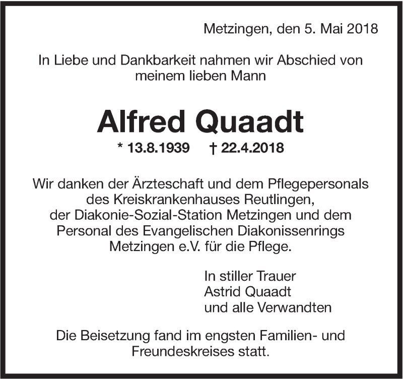 Hier finden Sie alle Traueranzeigen aus der Zeitung, die bisher für Alfred Quaadt erschienen sind. Weitere Traueranzeigen, die in der Zeitung erscheinen, werden hier ebenfalls aufgelistet