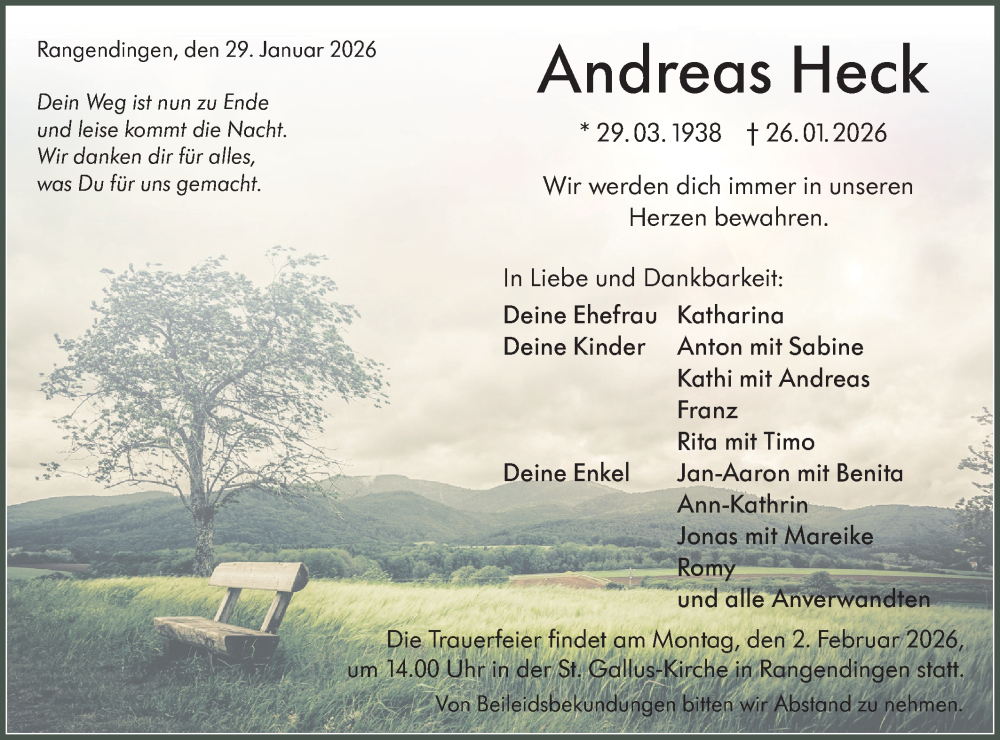 Hier finden Sie alle Traueranzeigen aus der Zeitung, die bisher für Andreas Heck erschienen sind. Weitere Traueranzeigen, die in der Zeitung erscheinen, werden hier ebenfalls aufgelistet