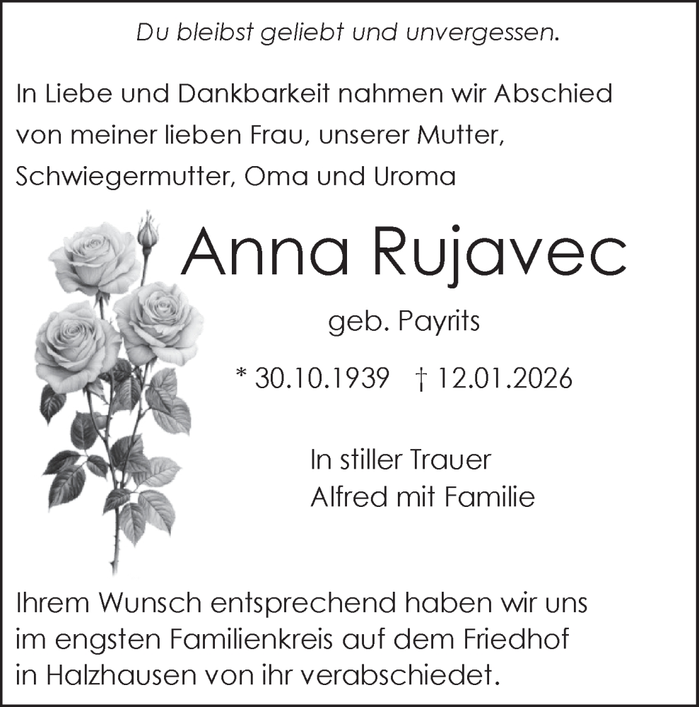Hier finden Sie alle Traueranzeigen aus der Zeitung, die bisher für Anna Rujavec erschienen sind. Weitere Traueranzeigen, die in der Zeitung erscheinen, werden hier ebenfalls aufgelistet
