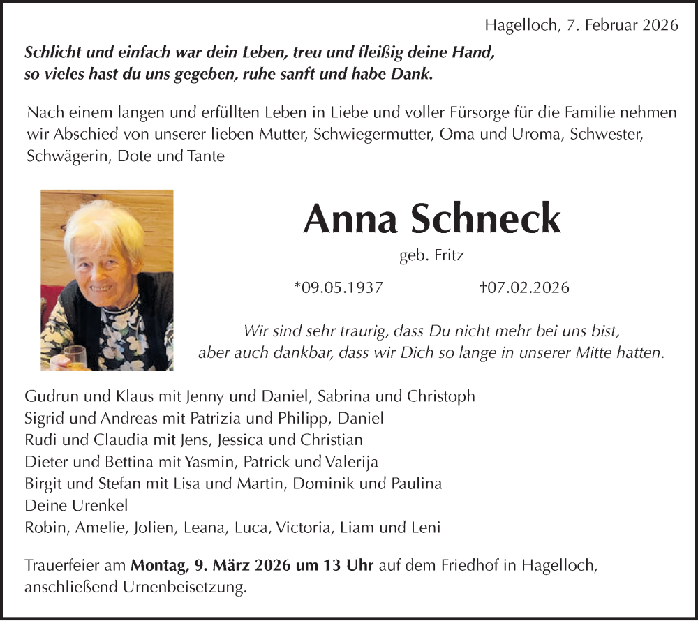 Hier finden Sie alle Traueranzeigen aus der Zeitung, die bisher für Anna Schneck erschienen sind. Weitere Traueranzeigen, die in der Zeitung erscheinen, werden hier ebenfalls aufgelistet
