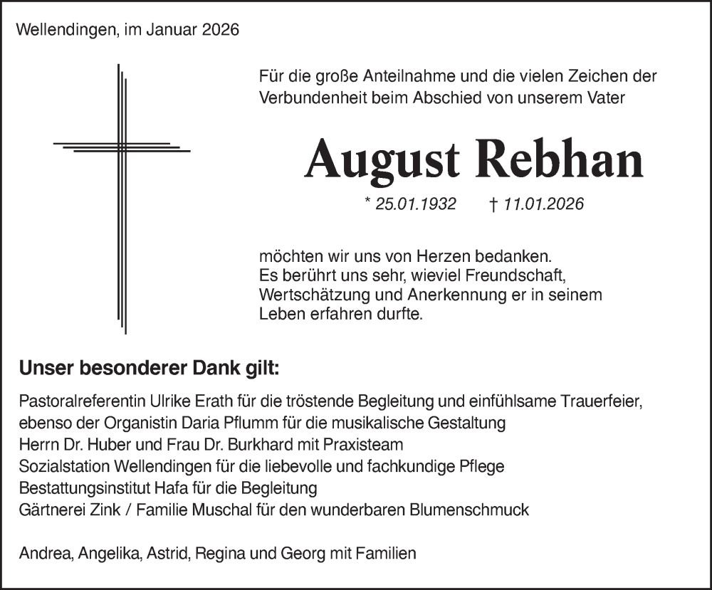 Hier finden Sie alle Traueranzeigen aus der Zeitung, die bisher für August Rebhan erschienen sind. Weitere Traueranzeigen, die in der Zeitung erscheinen, werden hier ebenfalls aufgelistet