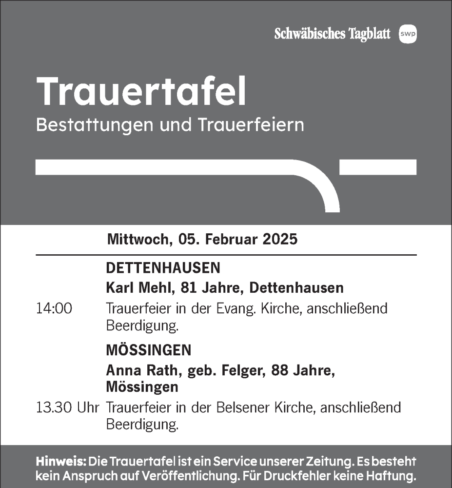 Hier finden Sie alle Traueranzeigen aus der Zeitung, die bisher für Bestattungen vom 05.02.2025 erschienen sind. Weitere Traueranzeigen, die in der Zeitung erscheinen, werden hier ebenfalls aufgelistet