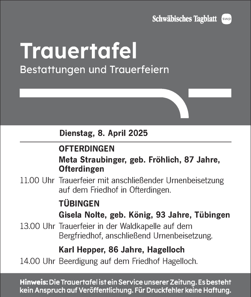 Hier finden Sie alle Traueranzeigen aus der Zeitung, die bisher für Bestattungen vom 08.04.2025 erschienen sind. Weitere Traueranzeigen, die in der Zeitung erscheinen, werden hier ebenfalls aufgelistet