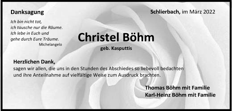 Hier finden Sie alle Traueranzeigen aus der Zeitung, die bisher für Christel Böhm erschienen sind. Weitere Traueranzeigen, die in der Zeitung erscheinen, werden hier ebenfalls aufgelistet