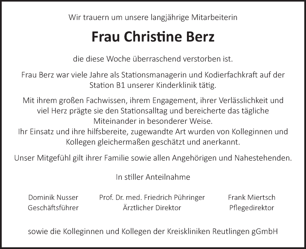 Hier finden Sie alle Traueranzeigen aus der Zeitung, die bisher für Christine Berz erschienen sind. Weitere Traueranzeigen, die in der Zeitung erscheinen, werden hier ebenfalls aufgelistet