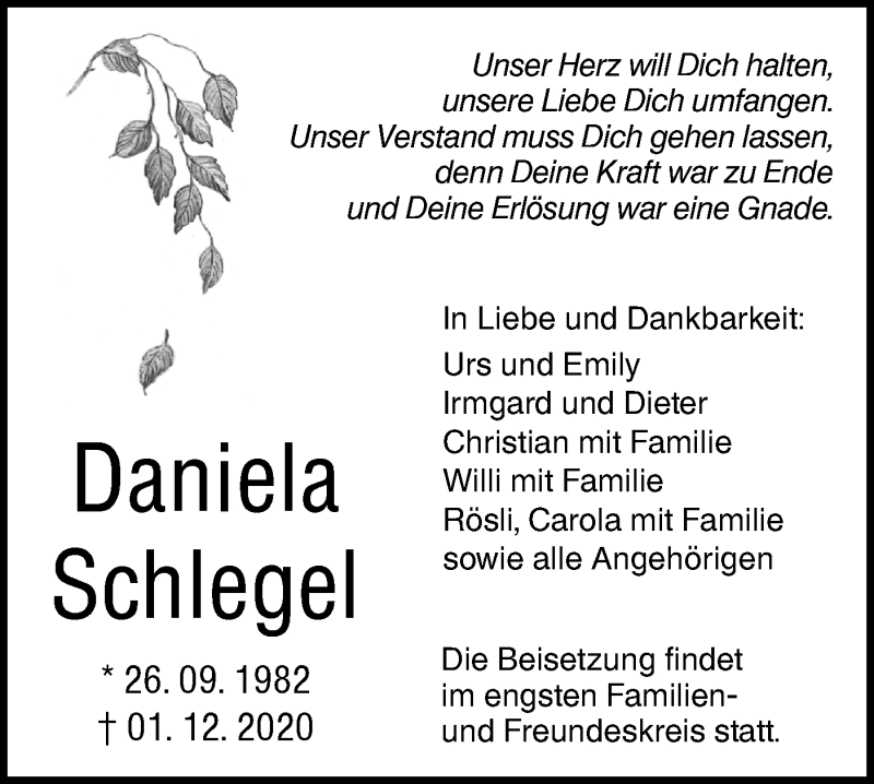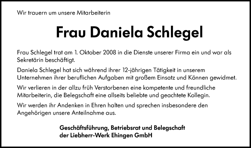 Hier finden Sie alle Traueranzeigen aus der Zeitung, die bisher für Daniela Schlegel erschienen sind. Weitere Traueranzeigen, die in der Zeitung erscheinen, werden hier ebenfalls aufgelistet
