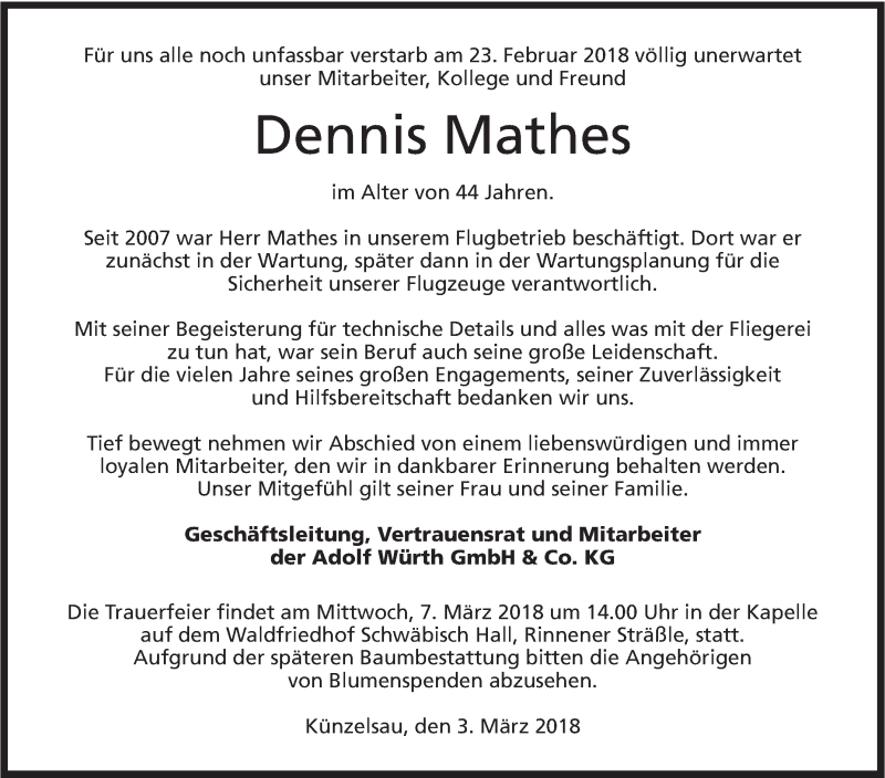 Hier finden Sie alle Traueranzeigen aus der Zeitung, die bisher für Dennis Mathes erschienen sind. Weitere Traueranzeigen, die in der Zeitung erscheinen, werden hier ebenfalls aufgelistet