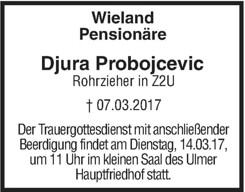 Hier finden Sie alle Traueranzeigen aus der Zeitung, die bisher für Djura Probojcevic erschienen sind. Weitere Traueranzeigen, die in der Zeitung erscheinen, werden hier ebenfalls aufgelistet