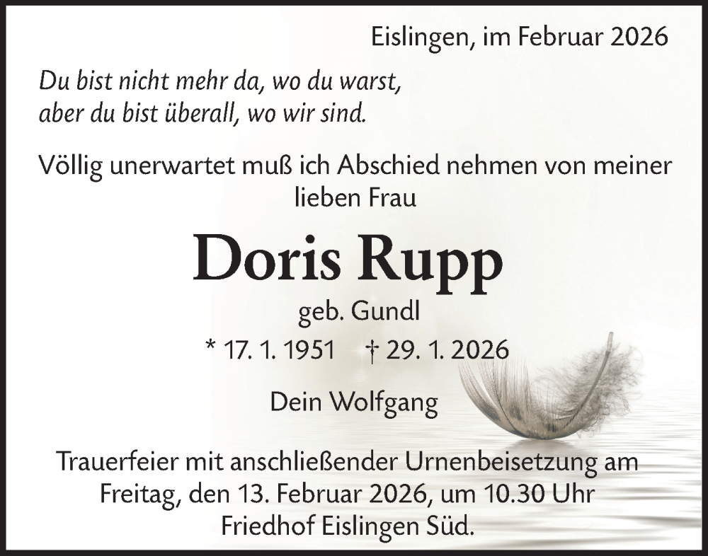 Hier finden Sie alle Traueranzeigen aus der Zeitung, die bisher für Doris Rupp erschienen sind. Weitere Traueranzeigen, die in der Zeitung erscheinen, werden hier ebenfalls aufgelistet