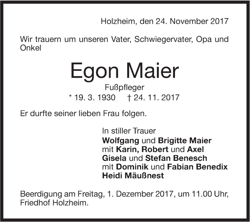 Hier finden Sie alle Traueranzeigen aus der Zeitung, die bisher für Egon Maier erschienen sind. Weitere Traueranzeigen, die in der Zeitung erscheinen, werden hier ebenfalls aufgelistet