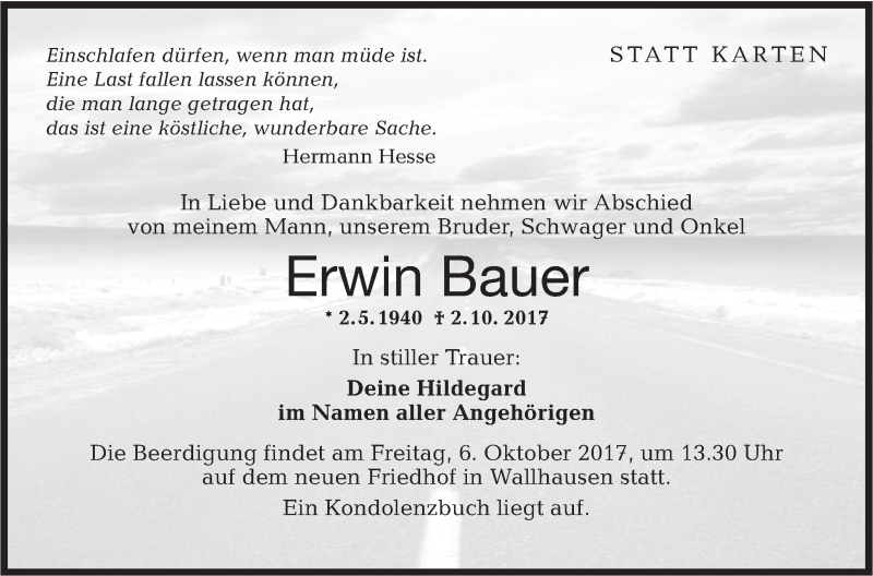 Hier finden Sie alle Traueranzeigen aus der Zeitung, die bisher für Erwin Bauer erschienen sind. Weitere Traueranzeigen, die in der Zeitung erscheinen, werden hier ebenfalls aufgelistet