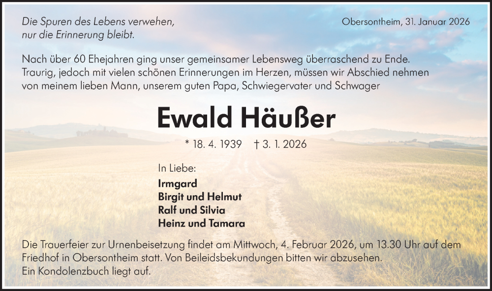 Hier finden Sie alle Traueranzeigen aus der Zeitung, die bisher für Ewald Häußer erschienen sind. Weitere Traueranzeigen, die in der Zeitung erscheinen, werden hier ebenfalls aufgelistet