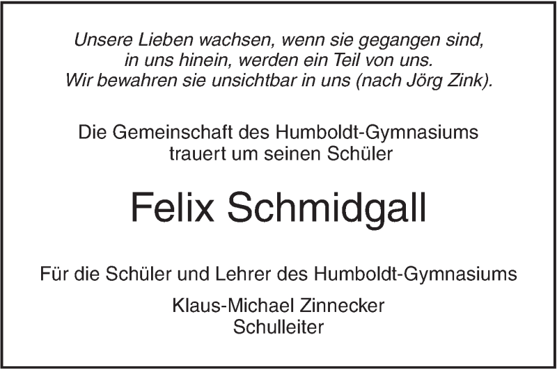 Hier finden Sie alle Traueranzeigen aus der Zeitung, die bisher für Felix Schmidgall erschienen sind. Weitere Traueranzeigen, die in der Zeitung erscheinen, werden hier ebenfalls aufgelistet