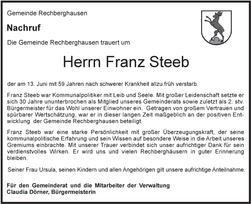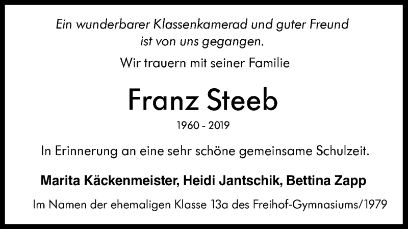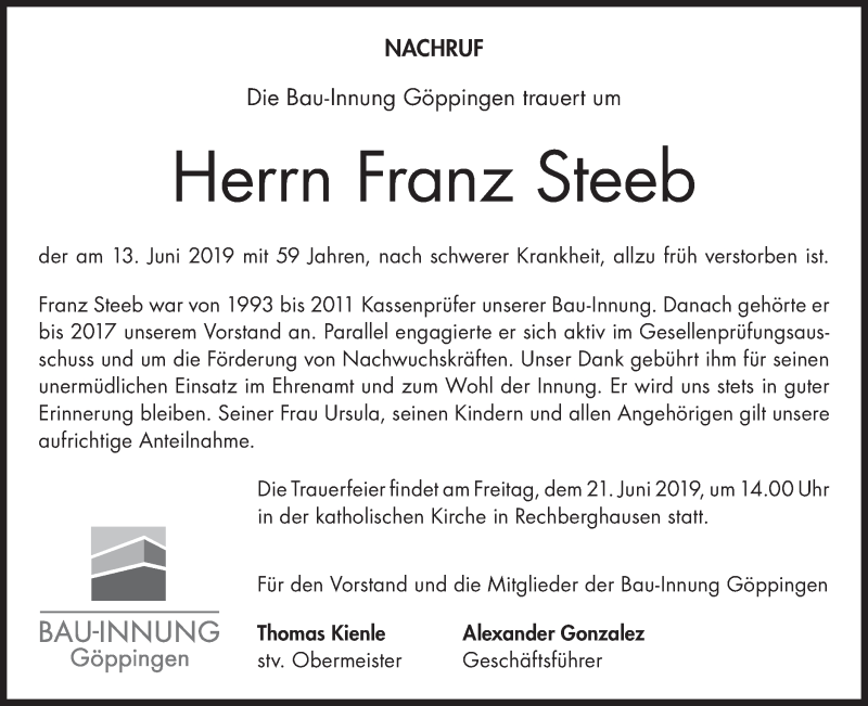 Hier finden Sie alle Traueranzeigen aus der Zeitung, die bisher für Franz Steeb erschienen sind. Weitere Traueranzeigen, die in der Zeitung erscheinen, werden hier ebenfalls aufgelistet