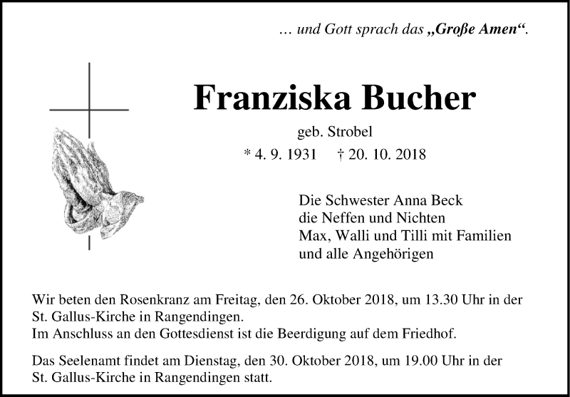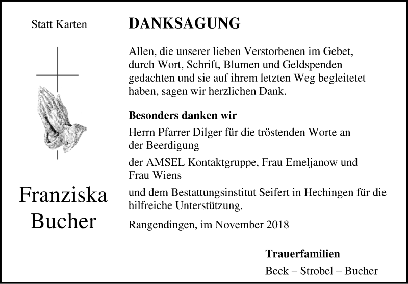 Hier finden Sie alle Traueranzeigen aus der Zeitung, die bisher für Franziska Bucher erschienen sind. Weitere Traueranzeigen, die in der Zeitung erscheinen, werden hier ebenfalls aufgelistet