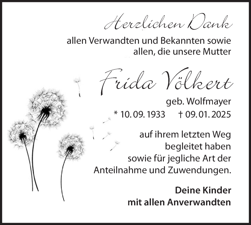 Hier finden Sie alle Traueranzeigen aus der Zeitung, die bisher für Frida Völkert erschienen sind. Weitere Traueranzeigen, die in der Zeitung erscheinen, werden hier ebenfalls aufgelistet
