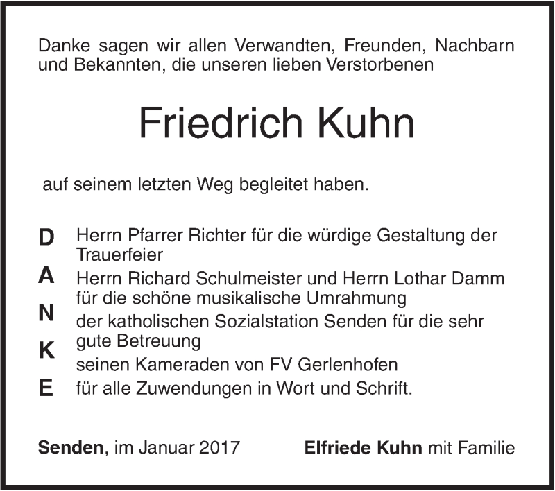 Hier finden Sie alle Traueranzeigen aus der Zeitung, die bisher für Friedrich Kuhn erschienen sind. Weitere Traueranzeigen, die in der Zeitung erscheinen, werden hier ebenfalls aufgelistet