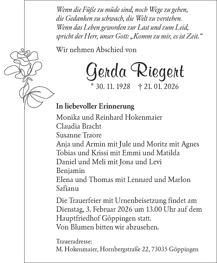 Hier finden Sie alle Traueranzeigen aus der Zeitung, die bisher für Gerda Riegert erschienen sind. Weitere Traueranzeigen, die in der Zeitung erscheinen, werden hier ebenfalls aufgelistet