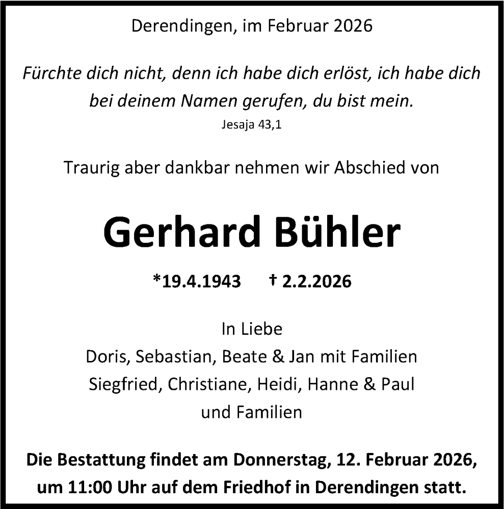 Hier finden Sie alle Traueranzeigen aus der Zeitung, die bisher für Gerhard Bühler erschienen sind. Weitere Traueranzeigen, die in der Zeitung erscheinen, werden hier ebenfalls aufgelistet