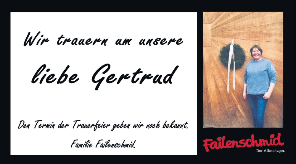 Hier finden Sie alle Traueranzeigen aus der Zeitung, die bisher für Gertrud Failenschmid erschienen sind. Weitere Traueranzeigen, die in der Zeitung erscheinen, werden hier ebenfalls aufgelistet