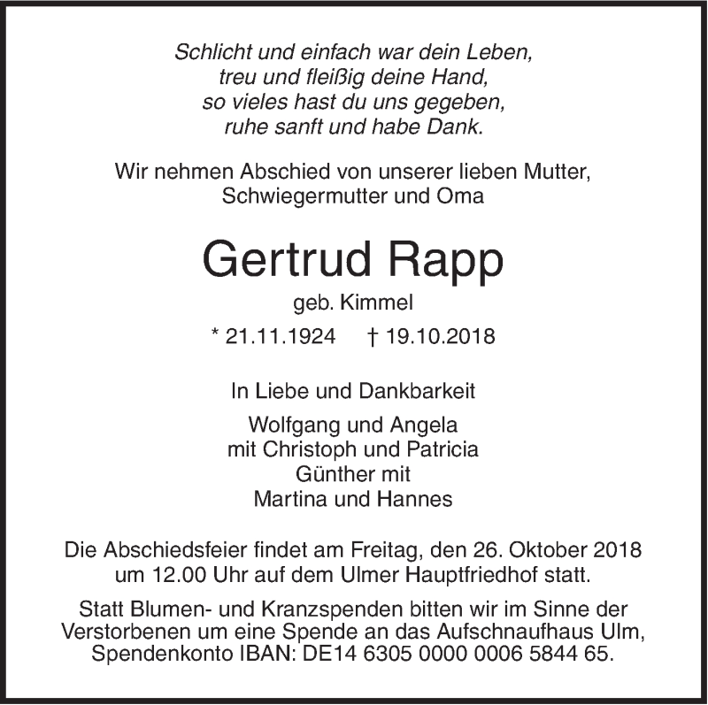Hier finden Sie alle Traueranzeigen aus der Zeitung, die bisher für Gertrud Rapp erschienen sind. Weitere Traueranzeigen, die in der Zeitung erscheinen, werden hier ebenfalls aufgelistet