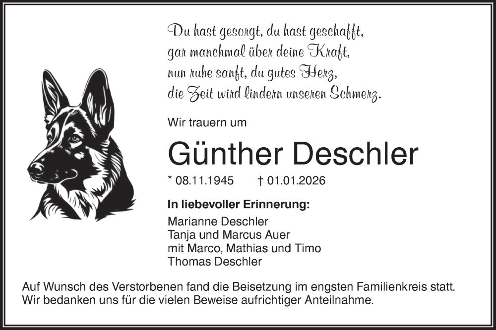 Hier finden Sie alle Traueranzeigen aus der Zeitung, die bisher für Günther Deschler erschienen sind. Weitere Traueranzeigen, die in der Zeitung erscheinen, werden hier ebenfalls aufgelistet