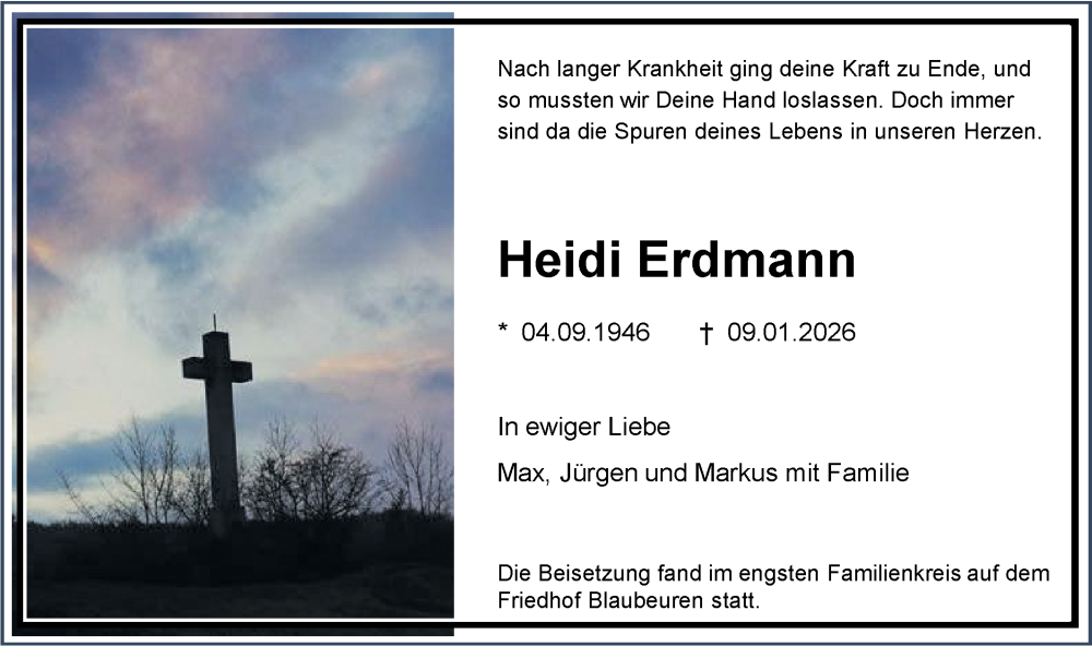 Hier finden Sie alle Traueranzeigen aus der Zeitung, die bisher für Heidi Erdmann erschienen sind. Weitere Traueranzeigen, die in der Zeitung erscheinen, werden hier ebenfalls aufgelistet