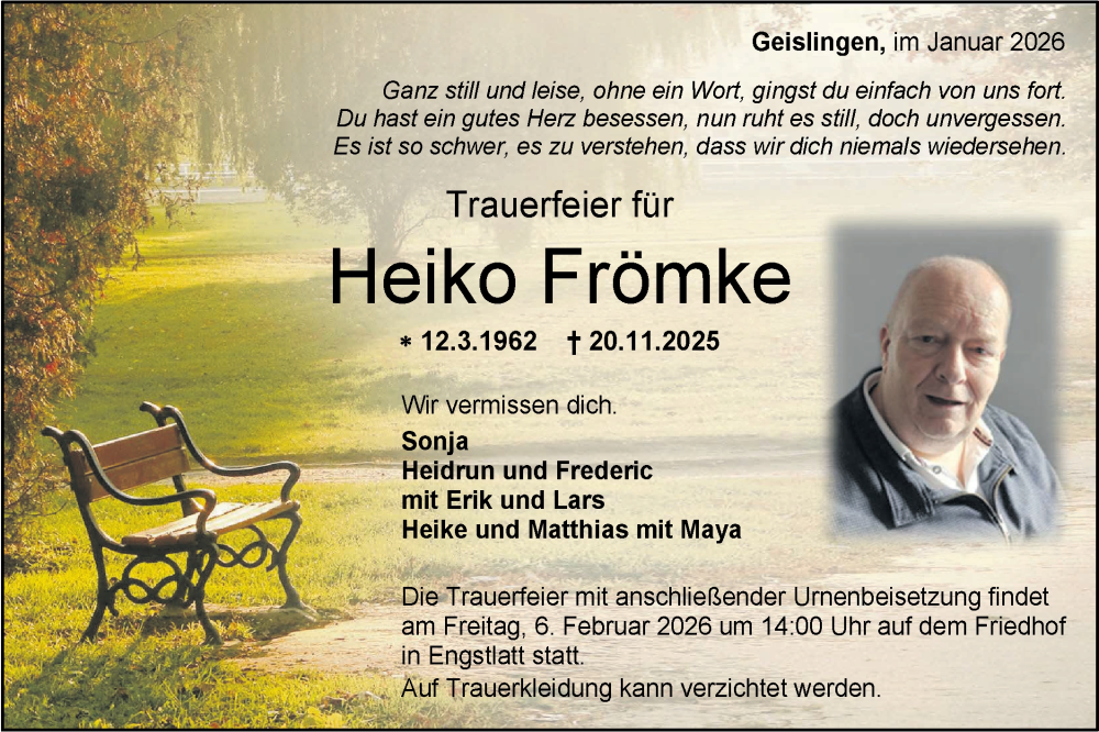 Hier finden Sie alle Traueranzeigen aus der Zeitung, die bisher für Heiko Frömke erschienen sind. Weitere Traueranzeigen, die in der Zeitung erscheinen, werden hier ebenfalls aufgelistet
