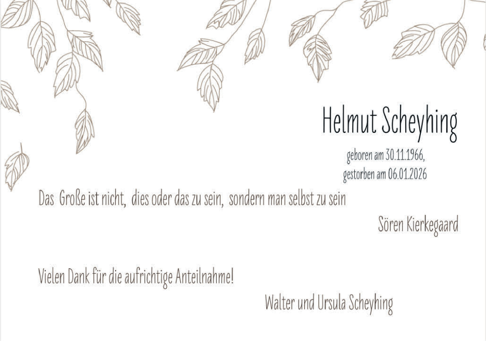 Hier finden Sie alle Traueranzeigen aus der Zeitung, die bisher für Helmut Scheyhing erschienen sind. Weitere Traueranzeigen, die in der Zeitung erscheinen, werden hier ebenfalls aufgelistet