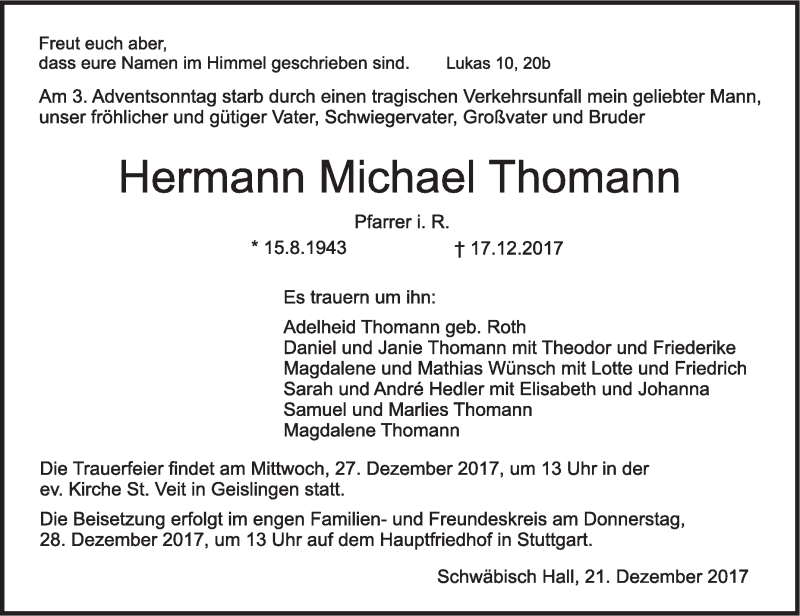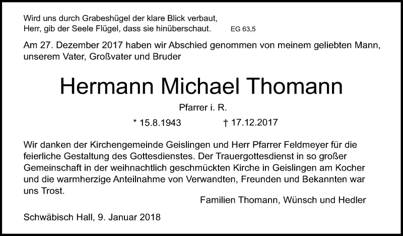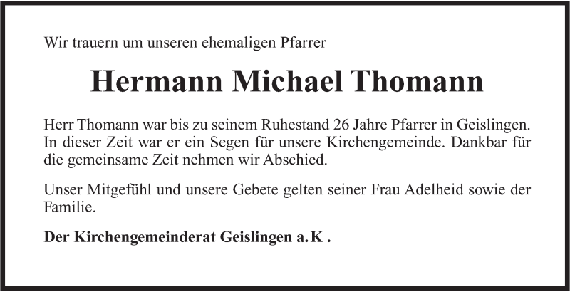 Hier finden Sie alle Traueranzeigen aus der Zeitung, die bisher für Hermann Michael Thomann erschienen sind. Weitere Traueranzeigen, die in der Zeitung erscheinen, werden hier ebenfalls aufgelistet