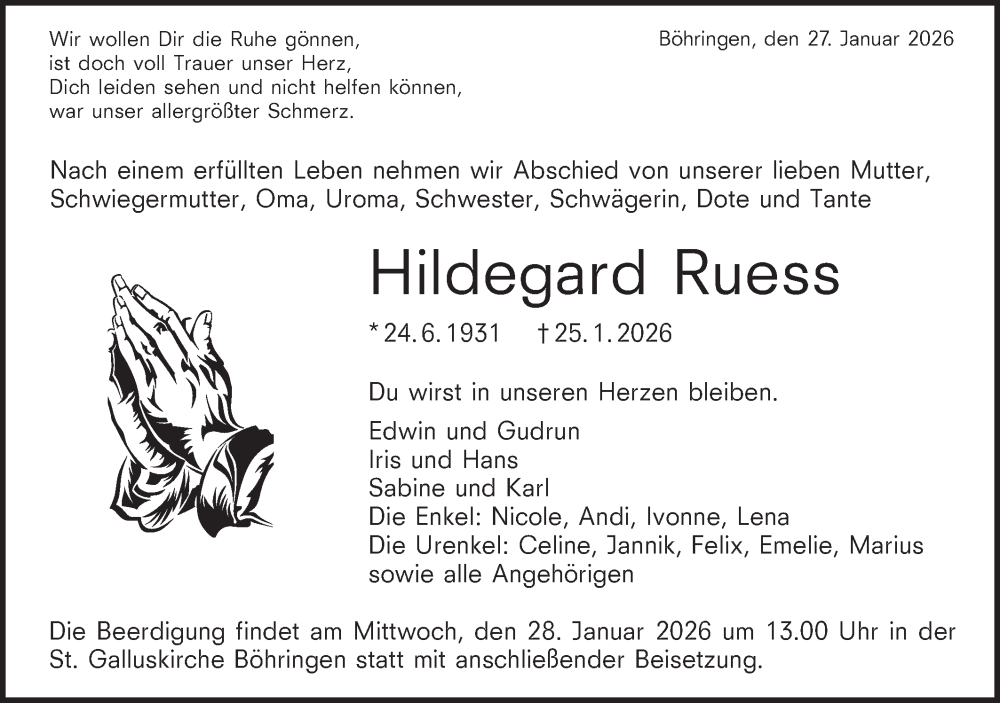 Hier finden Sie alle Traueranzeigen aus der Zeitung, die bisher für Hildegard Ruess erschienen sind. Weitere Traueranzeigen, die in der Zeitung erscheinen, werden hier ebenfalls aufgelistet