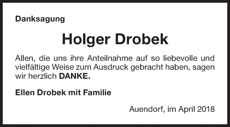 Hier finden Sie alle Traueranzeigen aus der Zeitung, die bisher für Holger Drobek erschienen sind. Weitere Traueranzeigen, die in der Zeitung erscheinen, werden hier ebenfalls aufgelistet