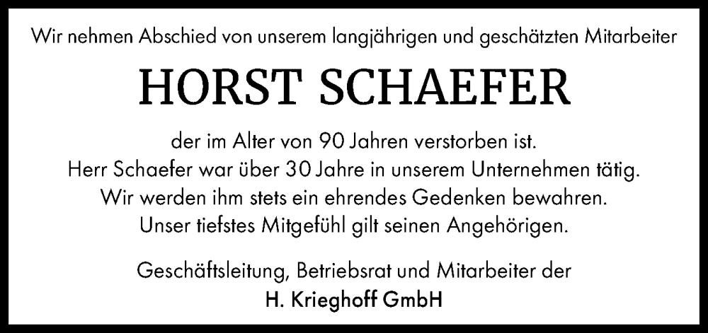 Hier finden Sie alle Traueranzeigen aus der Zeitung, die bisher für Horst Schaefer erschienen sind. Weitere Traueranzeigen, die in der Zeitung erscheinen, werden hier ebenfalls aufgelistet