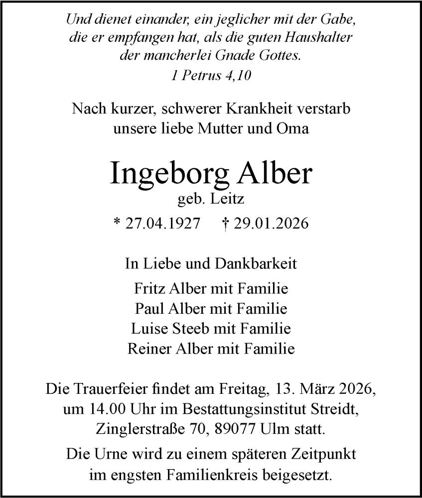 Hier finden Sie alle Traueranzeigen aus der Zeitung, die bisher für Ingeborg Alber erschienen sind. Weitere Traueranzeigen, die in der Zeitung erscheinen, werden hier ebenfalls aufgelistet