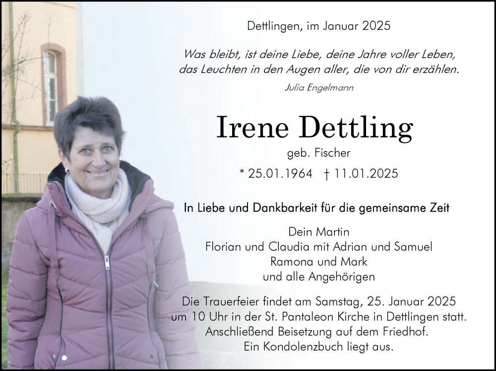 Hier finden Sie alle Traueranzeigen aus der Zeitung, die bisher für Irene Dettling erschienen sind. Weitere Traueranzeigen, die in der Zeitung erscheinen, werden hier ebenfalls aufgelistet
