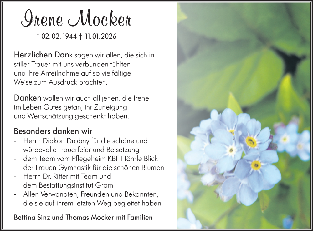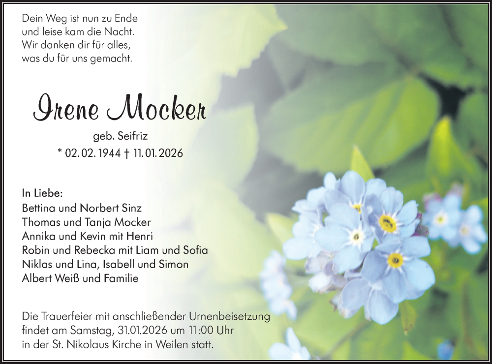 Hier finden Sie alle Traueranzeigen aus der Zeitung, die bisher für Irene Mocker erschienen sind. Weitere Traueranzeigen, die in der Zeitung erscheinen, werden hier ebenfalls aufgelistet