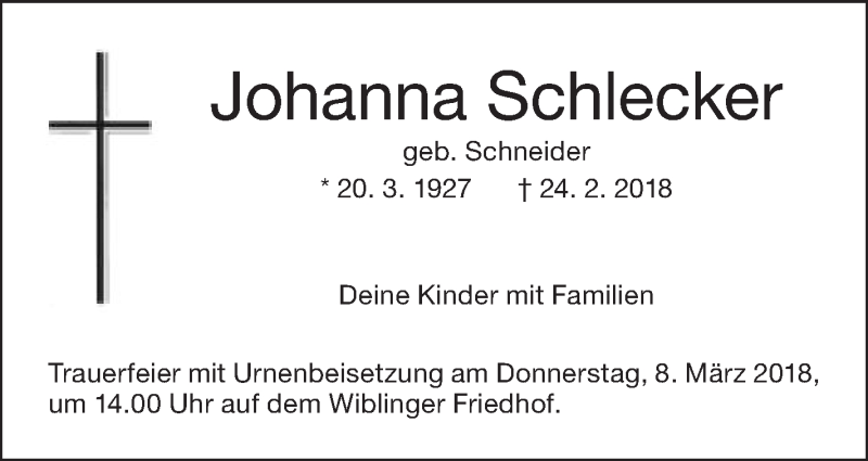 Hier finden Sie alle Traueranzeigen aus der Zeitung, die bisher für Johanna Schlecker erschienen sind. Weitere Traueranzeigen, die in der Zeitung erscheinen, werden hier ebenfalls aufgelistet