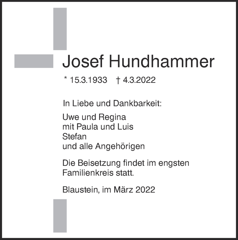 Hier finden Sie alle Traueranzeigen aus der Zeitung, die bisher für Josef Hundhammer erschienen sind. Weitere Traueranzeigen, die in der Zeitung erscheinen, werden hier ebenfalls aufgelistet