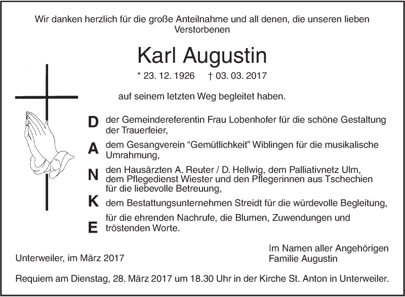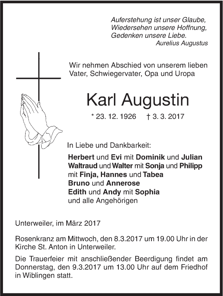Hier finden Sie alle Traueranzeigen aus der Zeitung, die bisher für Karl Augustin erschienen sind. Weitere Traueranzeigen, die in der Zeitung erscheinen, werden hier ebenfalls aufgelistet