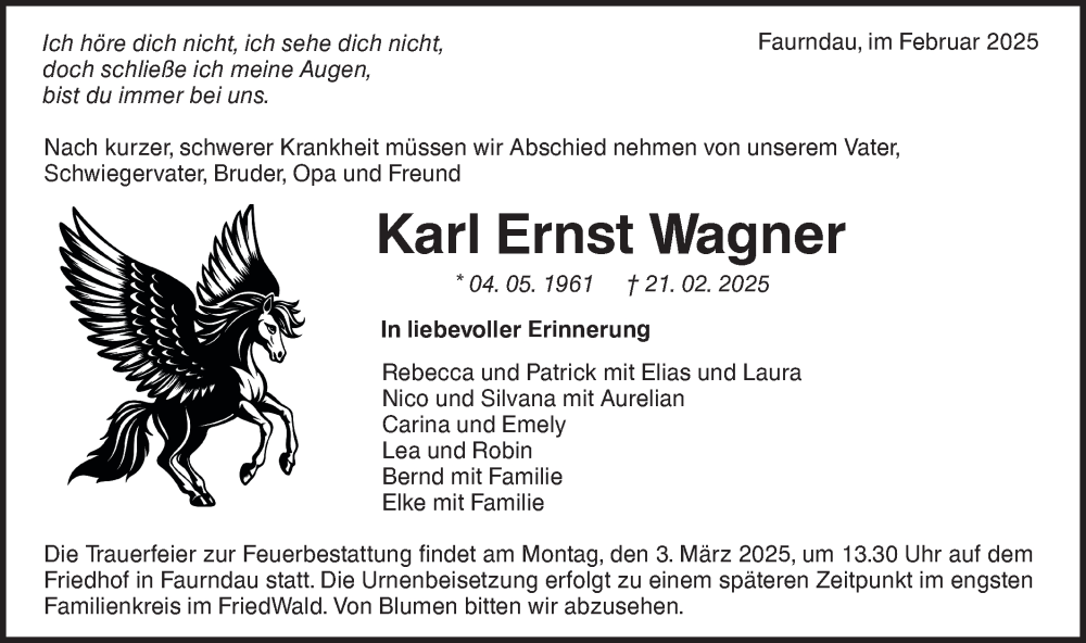 Hier finden Sie alle Traueranzeigen aus der Zeitung, die bisher für Karl Ernst Wagner erschienen sind. Weitere Traueranzeigen, die in der Zeitung erscheinen, werden hier ebenfalls aufgelistet