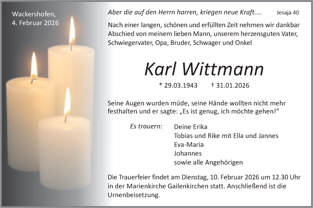 Hier finden Sie alle Traueranzeigen aus der Zeitung, die bisher für Karl Wittmann erschienen sind. Weitere Traueranzeigen, die in der Zeitung erscheinen, werden hier ebenfalls aufgelistet