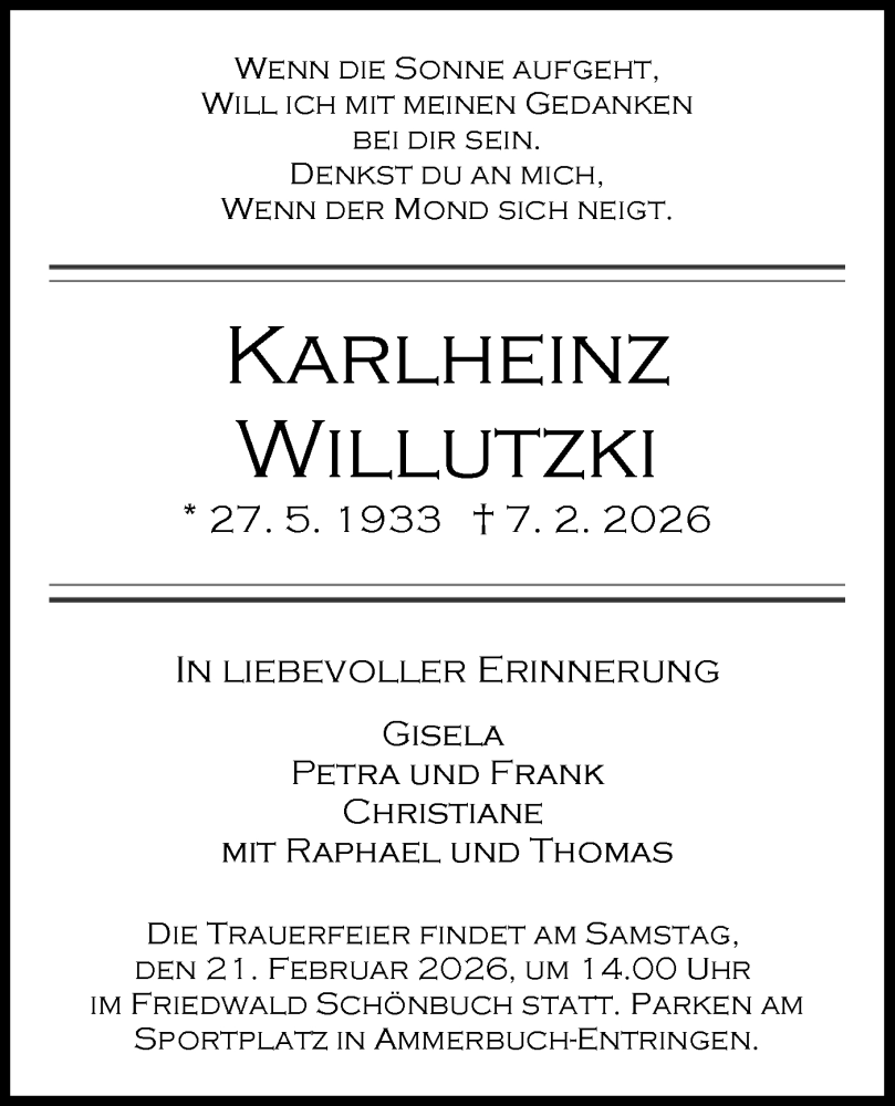 Hier finden Sie alle Traueranzeigen aus der Zeitung, die bisher für Karlheinz Willutzki erschienen sind. Weitere Traueranzeigen, die in der Zeitung erscheinen, werden hier ebenfalls aufgelistet