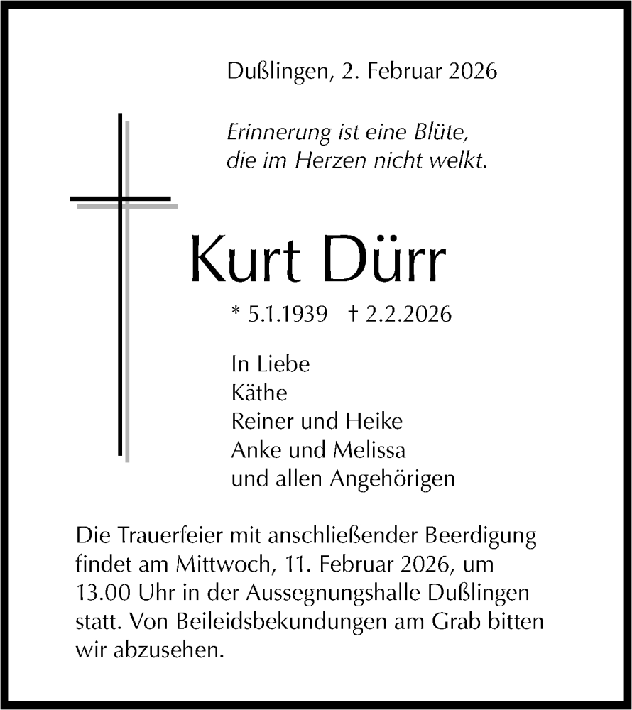 Hier finden Sie alle Traueranzeigen aus der Zeitung, die bisher für Kurt Dürr erschienen sind. Weitere Traueranzeigen, die in der Zeitung erscheinen, werden hier ebenfalls aufgelistet