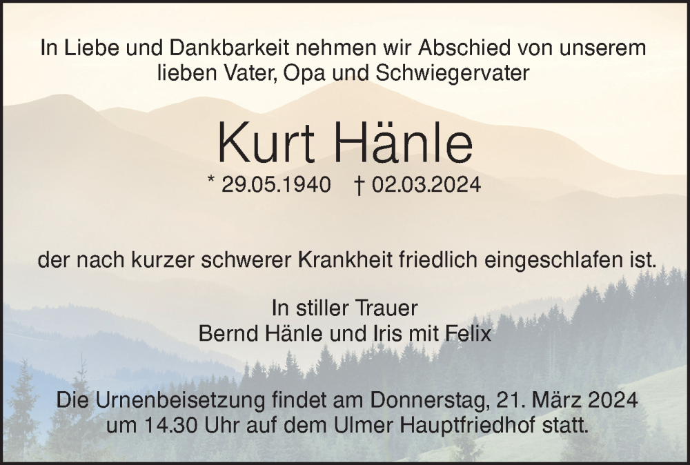 Hier finden Sie alle Traueranzeigen aus der Zeitung, die bisher für Kurt Hänle erschienen sind. Weitere Traueranzeigen, die in der Zeitung erscheinen, werden hier ebenfalls aufgelistet