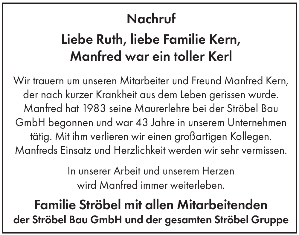 Hier finden Sie alle Traueranzeigen aus der Zeitung, die bisher für Manfred Kern erschienen sind. Weitere Traueranzeigen, die in der Zeitung erscheinen, werden hier ebenfalls aufgelistet