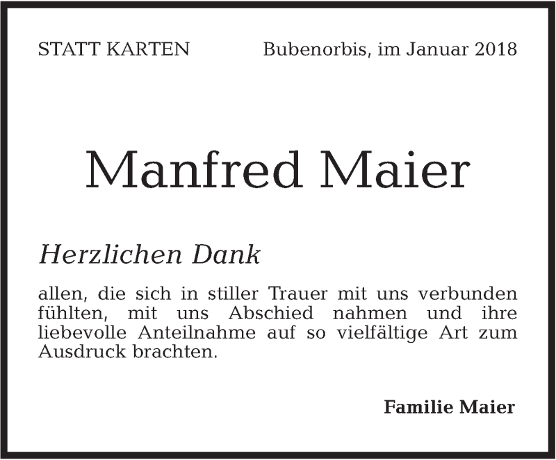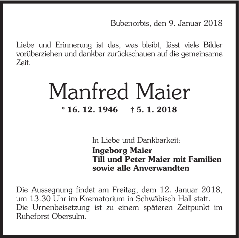 Hier finden Sie alle Traueranzeigen aus der Zeitung, die bisher für Manfred Maier erschienen sind. Weitere Traueranzeigen, die in der Zeitung erscheinen, werden hier ebenfalls aufgelistet