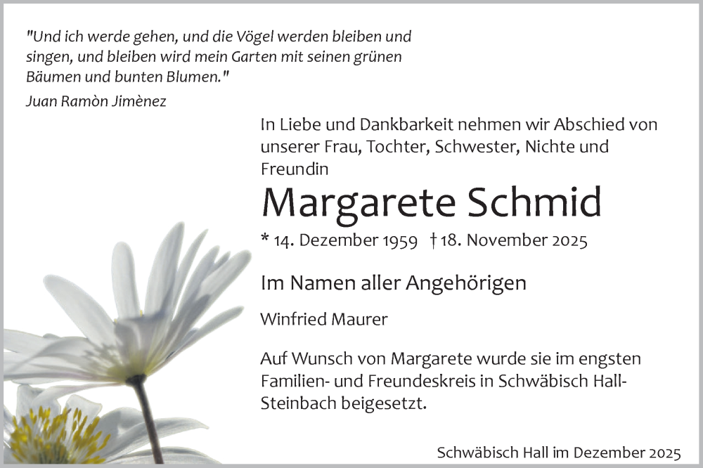Hier finden Sie alle Traueranzeigen aus der Zeitung, die bisher für Margarete Schmid erschienen sind. Weitere Traueranzeigen, die in der Zeitung erscheinen, werden hier ebenfalls aufgelistet