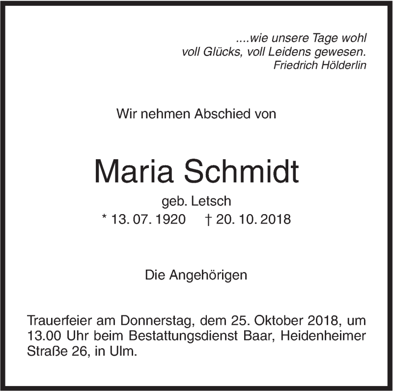 Hier finden Sie alle Traueranzeigen aus der Zeitung, die bisher für Maria Schmidt erschienen sind. Weitere Traueranzeigen, die in der Zeitung erscheinen, werden hier ebenfalls aufgelistet